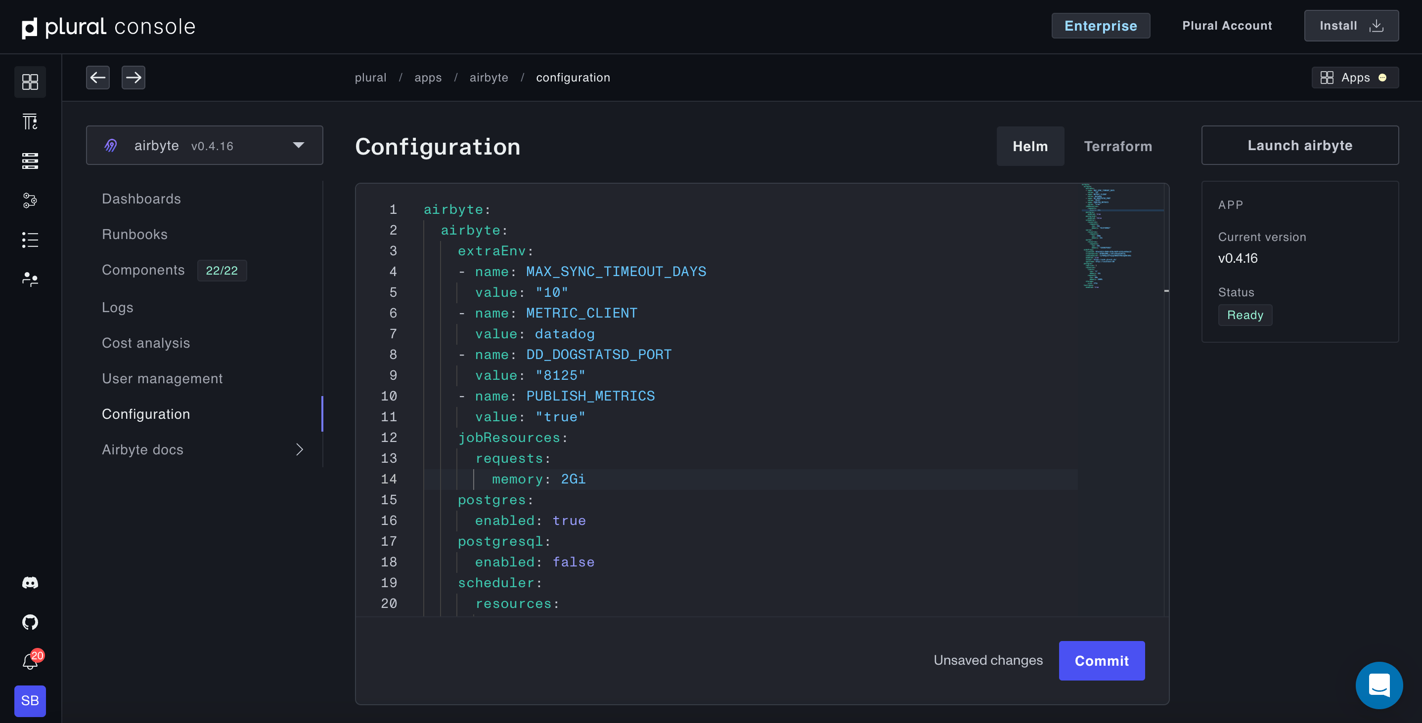 If you need to modify the Helm or Terraform for a given application, you can do so directly from the Plural Console. Navigate to the application you want to update, and click the Configuration sub-tab.